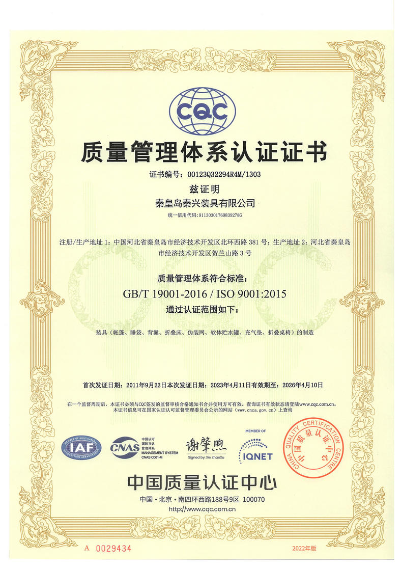 秦皇島秦興裝具有限公司有限公司源于我國第3524工廠,創(chuàng)建于2005年,占地面積30畝,是一家致力于研究,發(fā)展,制造和銷售為一體的綜合性裝具及紡織服裝加工生產(chǎn)企業(yè),我們的主要產(chǎn)品有單、棉帳篷,民用帳篷,旅游帳篷集各種機工產(chǎn)品等。